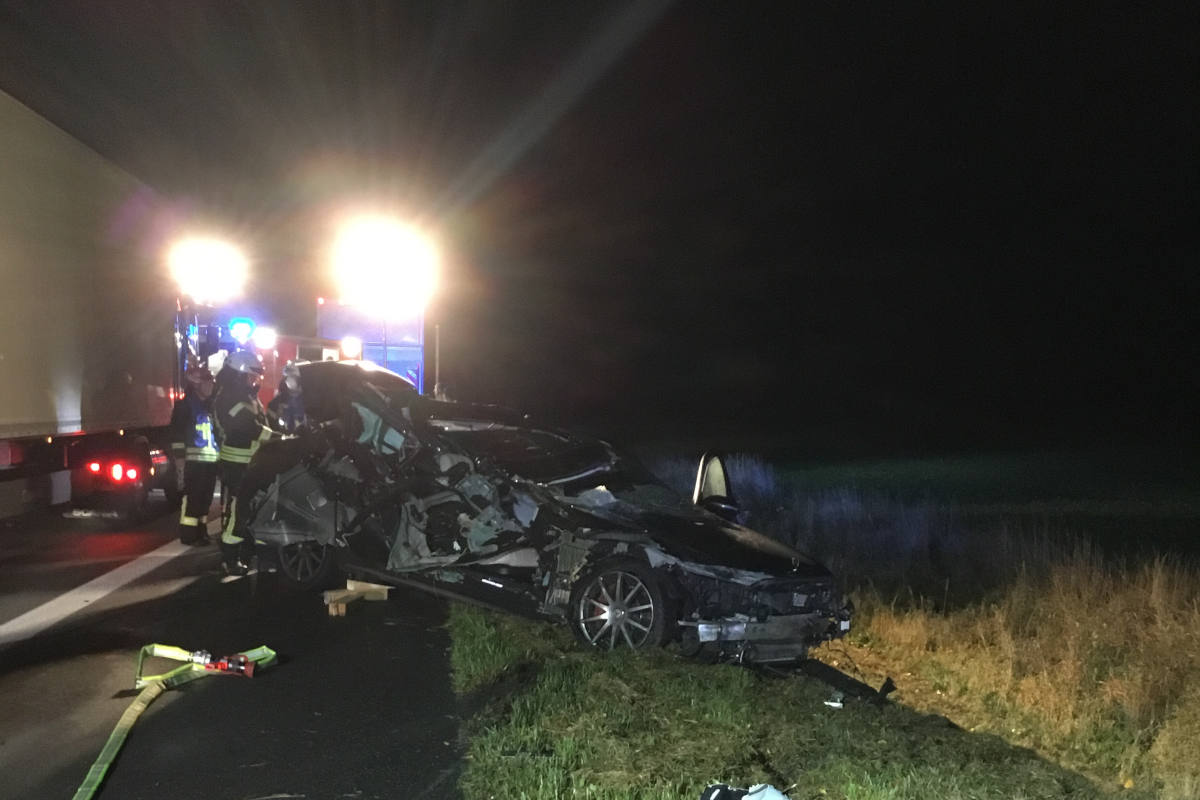 Ein Hammer fuhr mit einer Mercedes-Benz S-Klasse dabei mit hoher Geschwindigkeit auf der mittleren Fahrspur auf einen LKW auf. Dabei wurde die S-Klasse im Bereich der Beifahrerseite aufgerissen und das Dach eingedrückt. Das Fahrzeug schleuderte nach dem Zusammenprall noch über zweihundert Meter und kam auf dem Pannenstreifen zum Stillstand. Der 26-jährige Fahrer wurde bei dem Zusammenstoß verletzt. Entgegen erster Meldungen, er sei in seinem Fahrzeug eingeklemmt, konnte er dieses noch selbstständig verlassen.