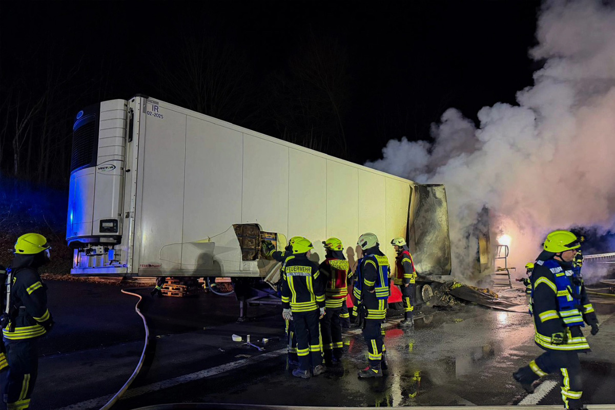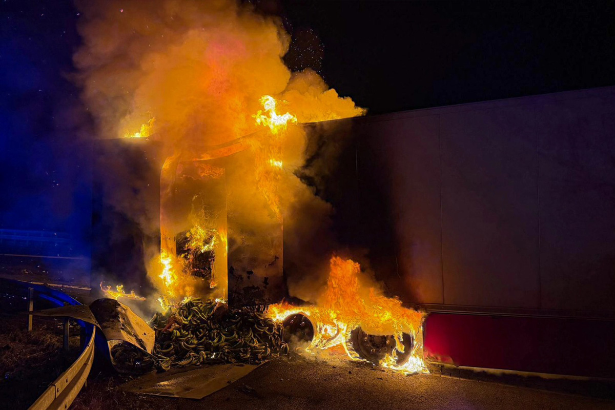 Dem Fahrer gelang es noch, die Zugmaschine im Bereich einer Rettungszufahrt abzukoppeln, sodass diese unversehrt blieb.