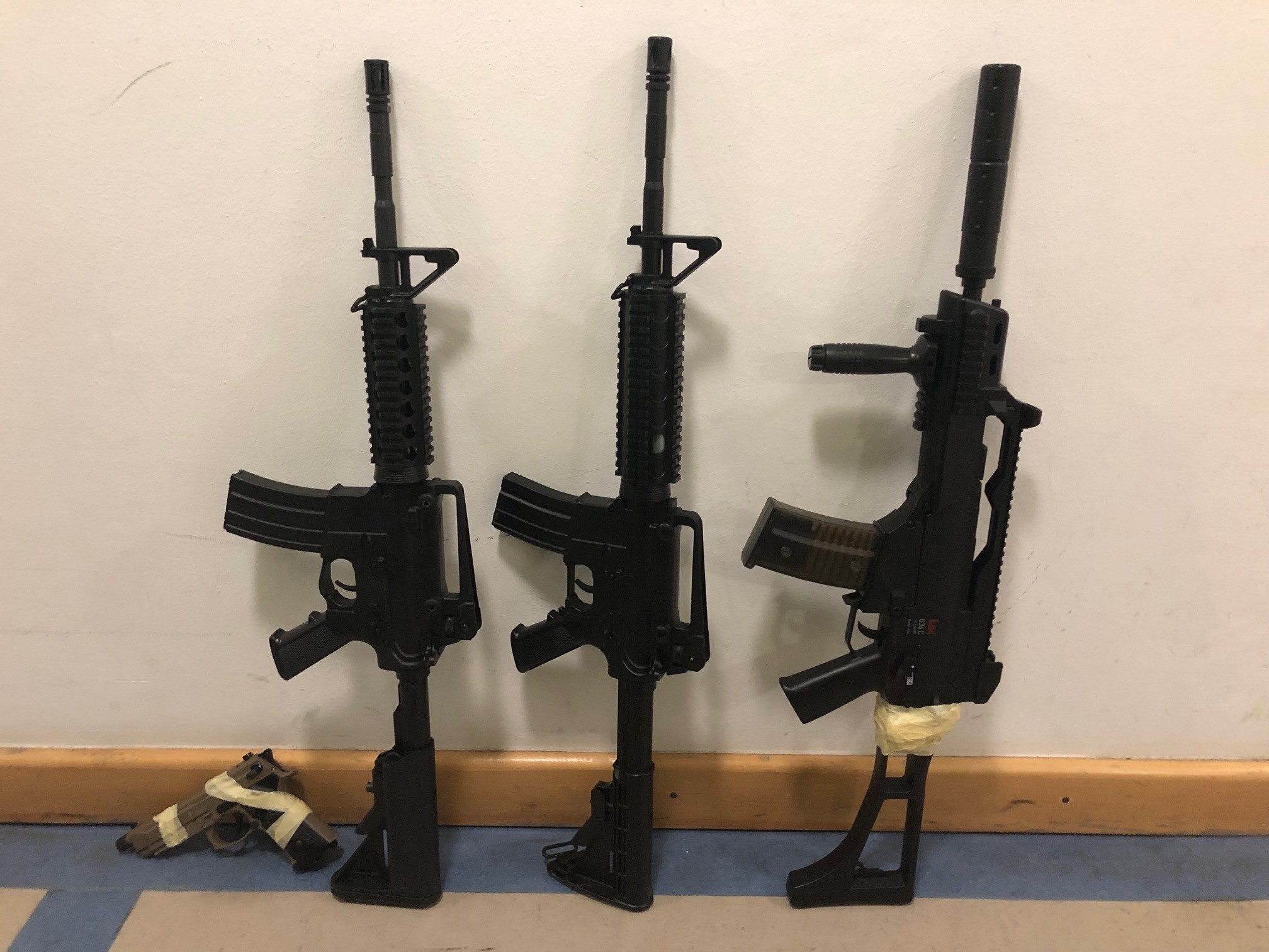 Zwei weitere Personen hielten am anderen Ende des Parkplatzes augenscheinlich Sturmgewehre in der Hand. Die eingesetzten Beamten konnten die täuschend echt aussehenden Waffen zum Glück rechtzeitig als sog. Softairwaffen identifizieren. Die zwischen 12- und 16-jährigen Bad Segeberger wurden an ihre Erziehungsberechtigten übergeben und eindringlich in einem erzieherischen Gespräch über die Gefahren aufgeklärt. Die Waffen wurden sichergestellt.