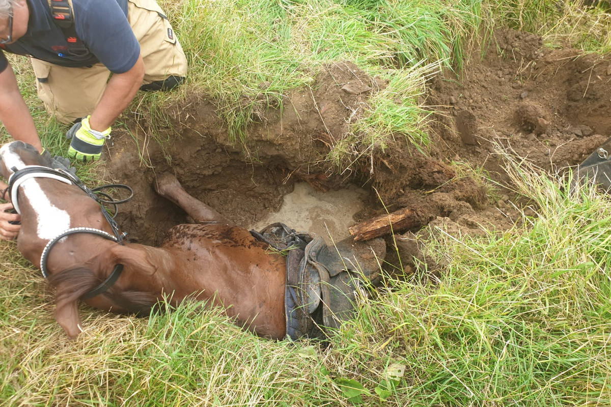 Schnell wurde deutlich, dass durch das Erdreich und weiter nachlaufendes Wasser schweres Gerät zur Rettung des Pferdes erforderlich sei. Von einem benachbarten Hof konnte ein Bagger organisiert werden, der durch einen sachkundigen Feuerwehrmann besetzt und bedient wurde. Behutsam wurde das Erdreich um die Einsturzstelle entfernt werden. Nach rund einer Stunde konnte das Pferd mit vereinten Kräften durch den geschaffenen Weg aus dem Loch geführt werden.