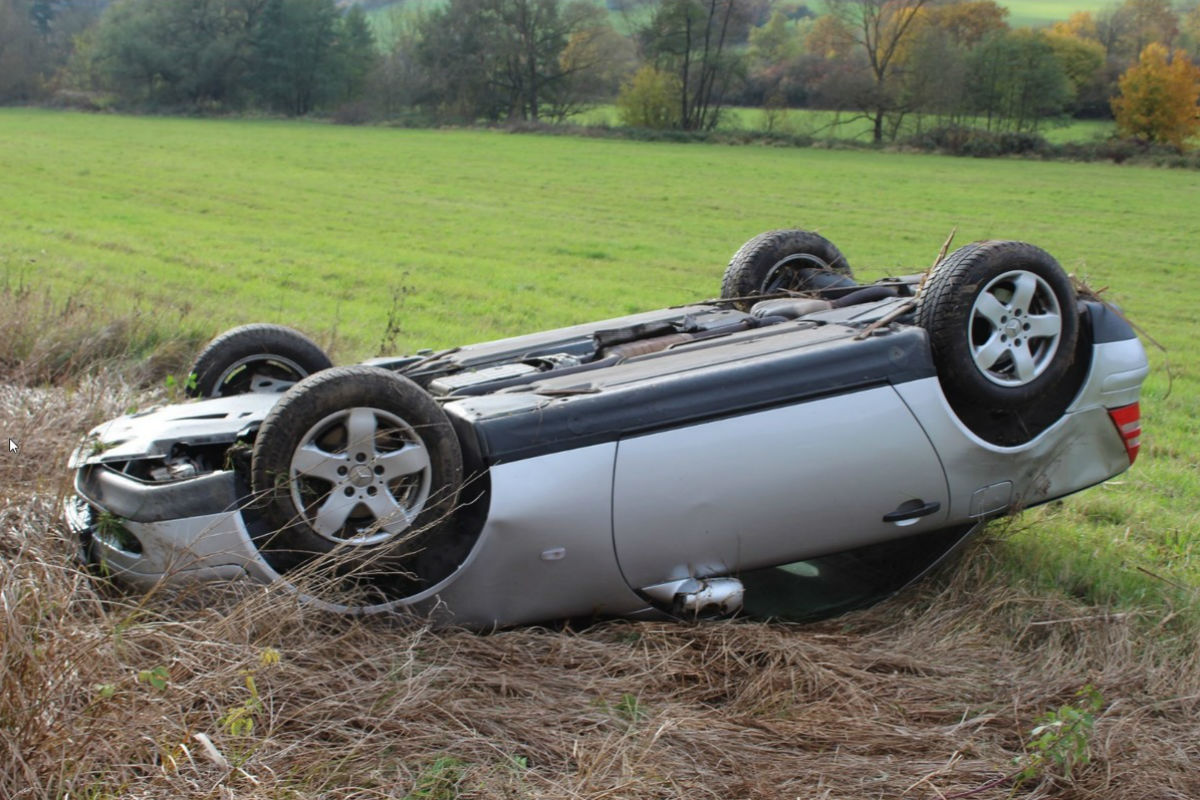 Nach Zeugenaussagen überholte der 21-jährige Fahrer aus Bad Kreuznach trotz durchgezogener Mittellinie zwei LKW und einen PKW, geriet wahrscheinlich aufgrund nicht angepasster Geschwindigkeit in einer Linkskurve ins Schleudern und kam dann mit seinem PKW nach rechts von der Fahrbahn ab, so dass dieser im angrenzenden Wiesengelände auf dem Dach zum Liegen kam.