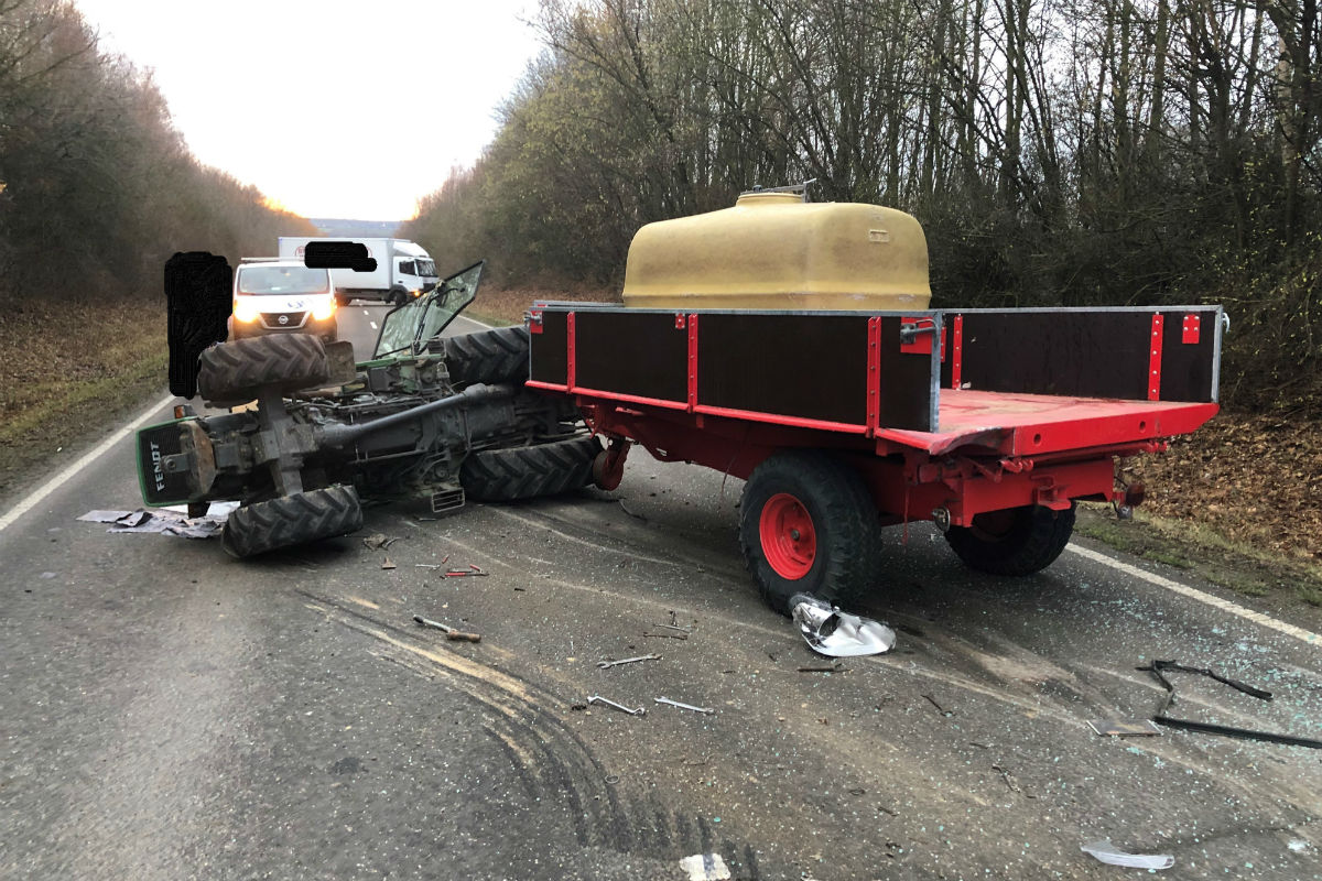 Ein 81-jähriger aus Dolgesheim fährt mit seinem Fahrzeug in gleicher Richtung. Kurz hinter einer leichten Kuppe bemerkt der Pkw-Fahrer das Traktorgespann zu spät und fährt auf dieses auf. Durch die wesentlich höher Geschwindigkeit des Pkw wird durch den Aufprall der Traktor umgeworfen und das Gespann kommt auf beiden Richtungsfahrbahnen zum liegen.