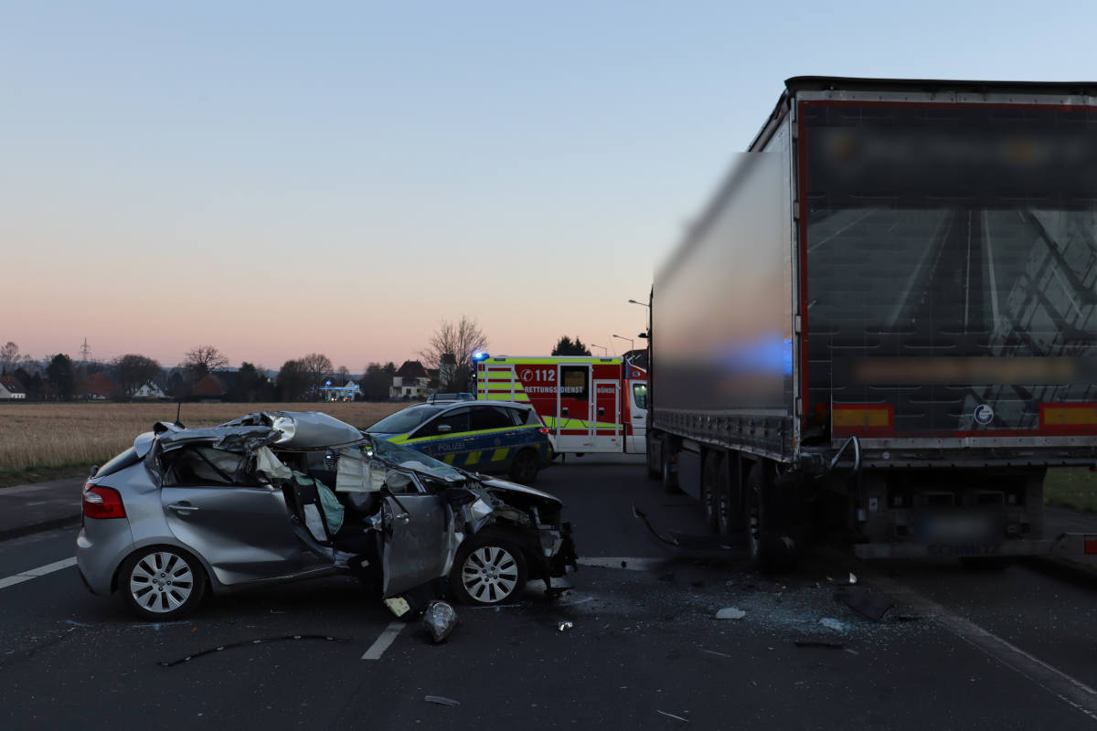 Ein 83-jähriger Löhner fuhr mit seinem Kia aus Hüllhorst kommend in Richtung Löhne. Kurz hinter der Einmündung zum Frieweg fuhr der Mann plötzlich aus bisher nicht geklärter Ursache auf einen am Fahrbahnrand geparkten großen LKW auf. Durch die Wucht des Aufpralls wurde der Mann schwer verletzt. Nach einer notärztlichen Versorgung vor Ort wurde er zur stationären Behandlung in ein Krankenhaus gebracht.