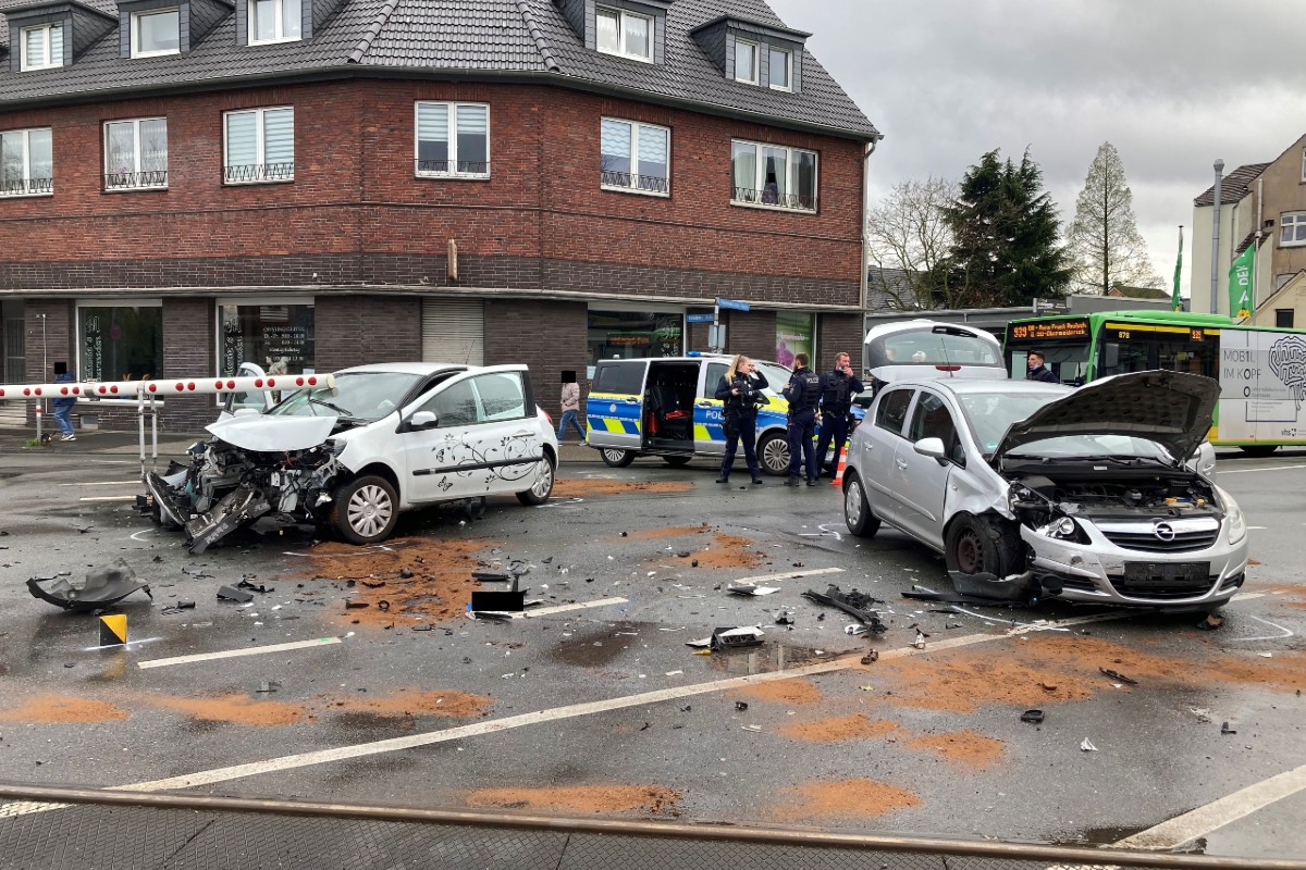 Umgehend alarmierte die Leitstelle ein Hilfeleistungslöschfahrzeug, zwei Rettungswagen ein Notarzteinsatzfahrzeug und den Führungsdienst mit einem Einsatzleitwagen zur Einsatzstelle. Vor Ort stellte sich die Lage wie folgt dar. Es war zu einem Verkehrsunfall zwischen zwei PKW im Kreuzungsbereich gekommen. Aufgrund des Zusammenstoßes rutschten die Fahrzeuge unter die bereits geschlossenen Bahnschranken im Bereich Duisburger Straße.