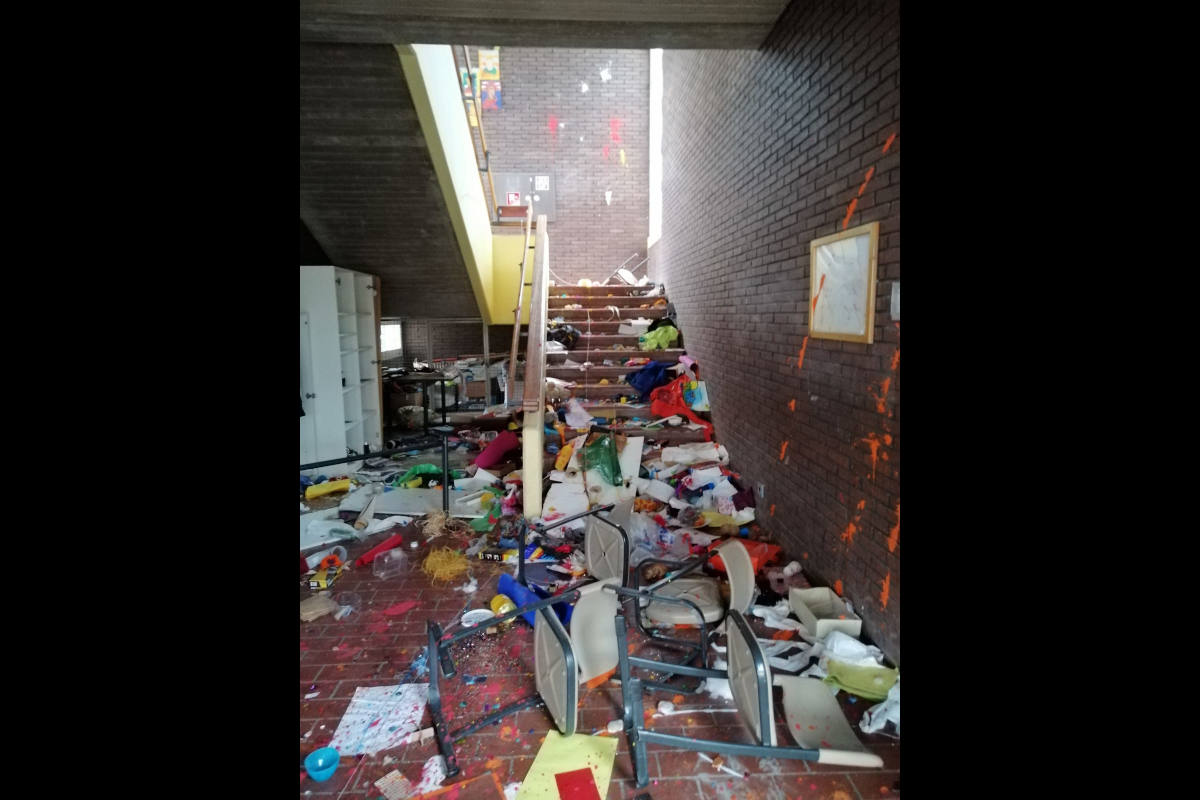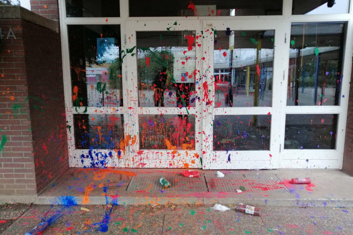 Im Inneren beschädigten sie Sport- und Turngeräte. Des Weiteren betraten die Täter das Schulgebäude, indem sie eine Tür aufbrachen. Das Treppenhaus wurde mittels Bastelutensilien, Farbe und umgeworfenen Stühlen verwüstet. Die Eingangstür und die Außenfassade der Schule wurden mit Farbe verunreinigt.